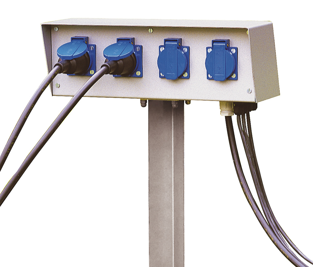 Energiesäule für den Außenbereich mit vier Schutzkontaktsteckdosen inkl. Klappdeckel, drei Ausgängen für metrische Kabelverschraubungen nach EN 50262 M12 (Kabel-Ø: 2,5-6,5mm) und einem Eingang für metrische Kabelverschraubung nach EN 50262 M25 (Kabel-Ø: 9-17mm). In dem großzügig konstruierten Gehäuse aus lackiertem Stahlblech können Trafos, welche nicht für den Außenbereich geeignet sind, untergebracht werden. Zur einfachen Montage befindet sich ein Erdspieß im Lieferumfang.
