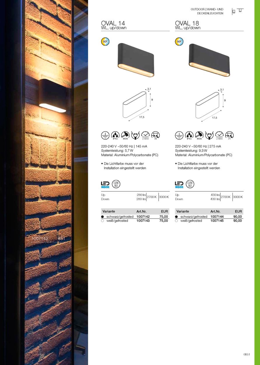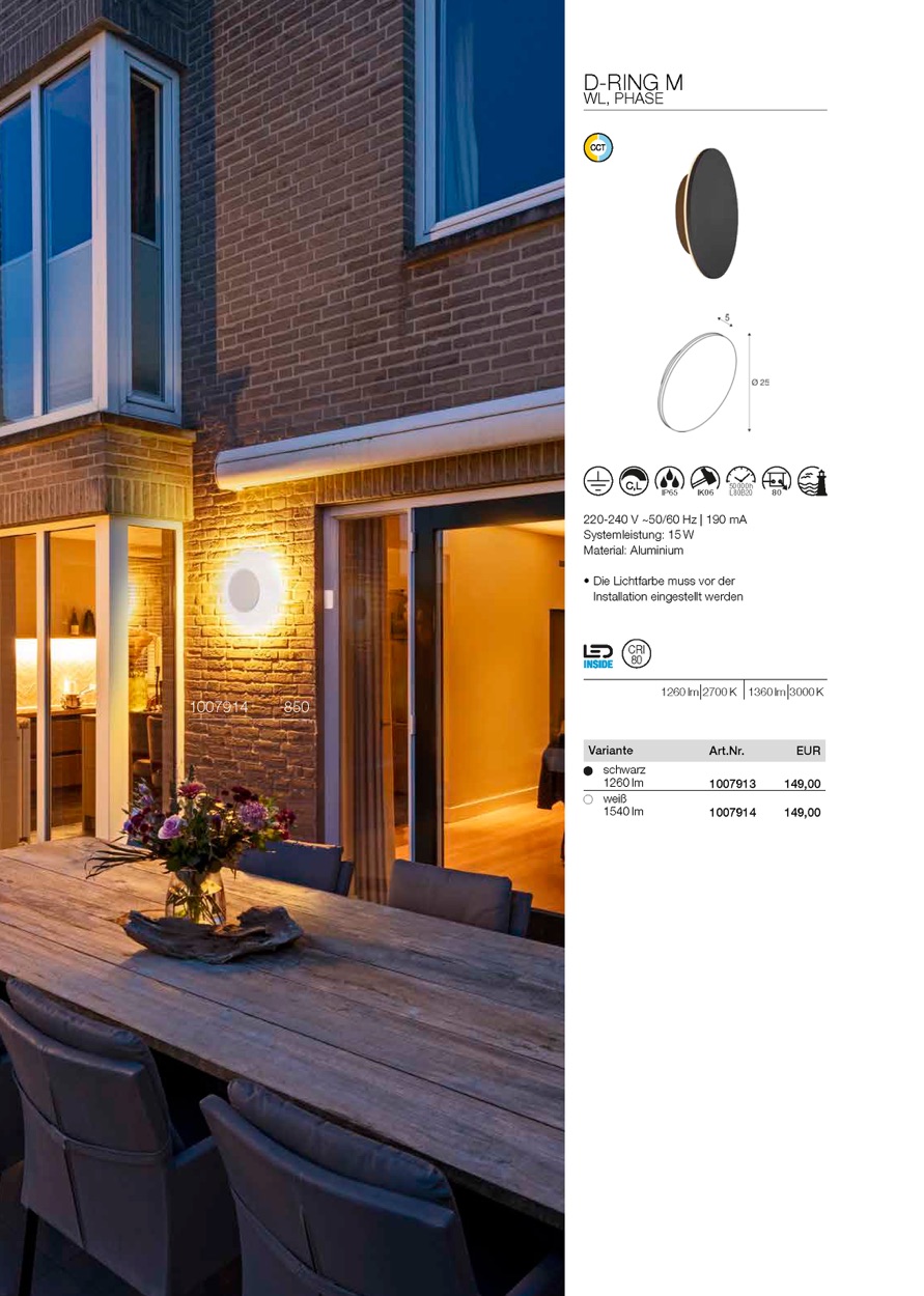 Elegant greift die neue D-RING Familie den Trend zu organischen Formen auf. Dabei setzt das dimmbare indirekte und via CCT-Switch einstellbare warmweiße Licht (2700 K / 3000 K) die Fassaden dezent und blendfrei in Szene. Die zwei unterschiedlichen Durchmesser bieten gestalterischen Spielzaum. Dank der speziellen Oberflächenbehandlung ist zudem der Einsatz in Küstennähe möglich.