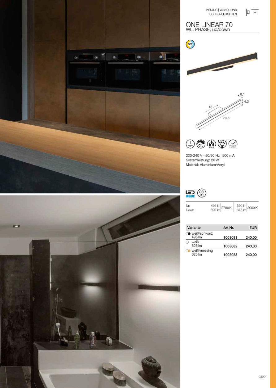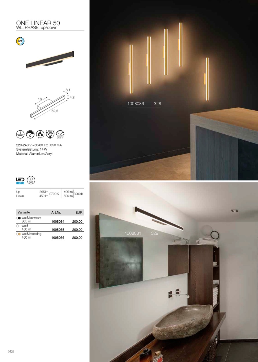ONE LINEAR erweitert die beliebte SLV Leuchtenfamilie um hochwertige Wandleuchten, die in zwei neuen Längen (50 cm und 70 cm) erhältlich sind. Dabei zaubert die Up/Down-Beleuchtung mit einer einstellbaren Farbtemperatur (2700 K/3000 K) und der PHASE-Dimmfunktion eine äußerst elegante und flexible Lichtstimmung herbei. Dank ihrer Schutzklasse IP44 ist die ONE LINEAR Wandleuchte nicht nur in der Hotellerie, Gastronomie und in Wohnräumen, sondern auch im Badezimmer ein stilvolles Highlight.