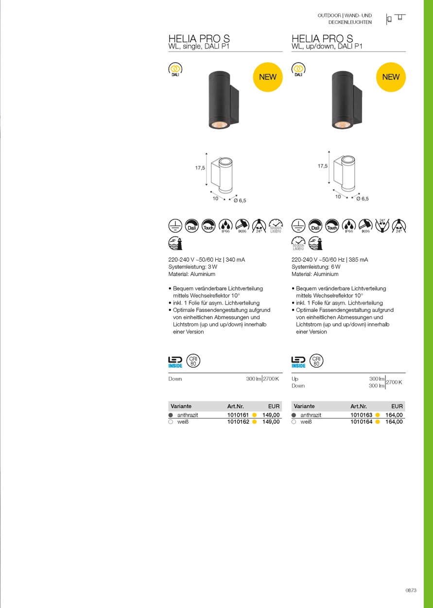 Die HELIA PRO Wandleuchtenfamilie bietet mit zwei Gehäusegrößen und zwei Leistungsklassen, wahlweise als Single- oder Up/Down-Beleuchtung, flexible Lösungen für die Akzentuierung von Fassaden. Effiziente LED-Technik, DALI-Steuerung, präzise Lichtverteilung und Seeluftbeständigkeit ermöglichen hochwertige Architekturbeleuchtung im Außenbereich.
