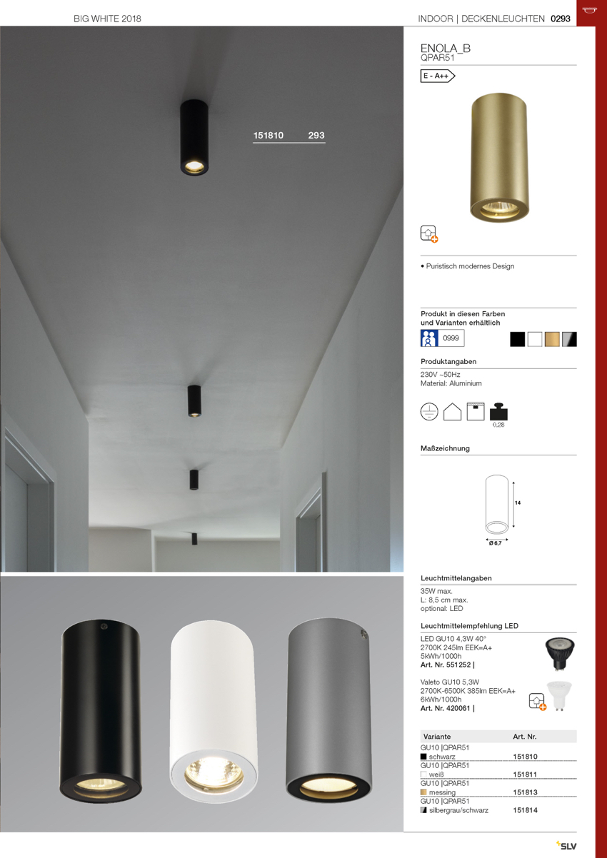 Die puristische Deckenaufbauleuchte ENOLA_B CL-1 besteht aus einer Aluminium Konstruktion und ist wahlweise verfügbar in den Gehäusefarben schwarz, weiß, messing und silbergrau. Durch die eingebaute GU10 Hochvoltfassung ist ENOLA_B CL-1 fertig für den direkten Anschluss an 230V Netzspannung.