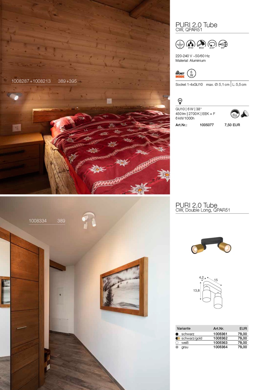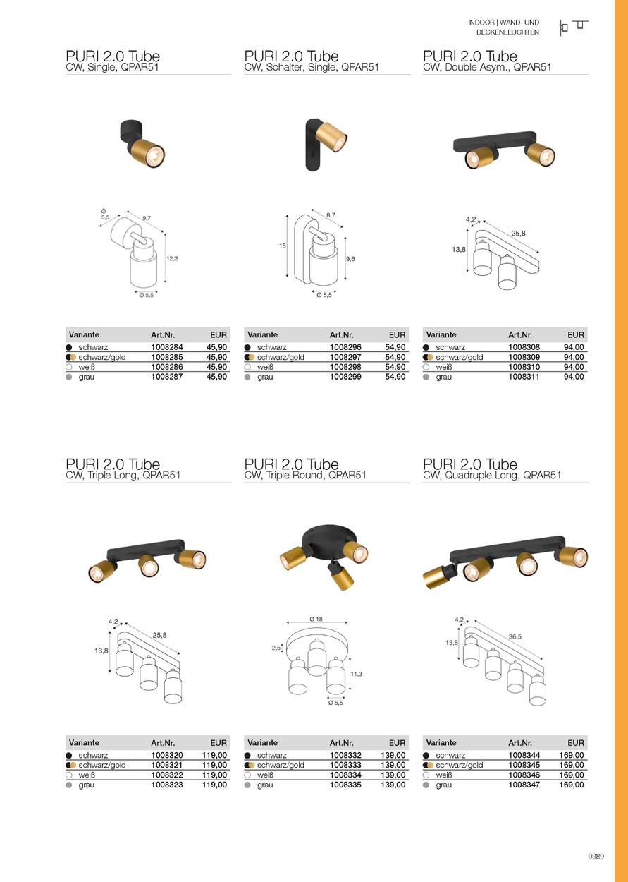 Die neue und rundum modernisierte PURI 2.0 Produktfamilie beinhaltet Spots und Pendelleuchten für das 1- und 3-Phasen-System sowie Wand- und Deckenaufbauleuchten in vielfältigen Ausführungen und Farben. Durch die Kombination mit den Leuchtenschirmen in drei modernen Formen und sechs trendigen Farben gibt es für jedes Interior eine passende PURI 2.0. Und falls Sie eine ganz spezielle Leuchte zusammensetzen möchten, gibt es die PURI 2.0 auch als Mix & Match System. Alle Leuchten werden mit GU10 Leuchtmitteln betrieben.