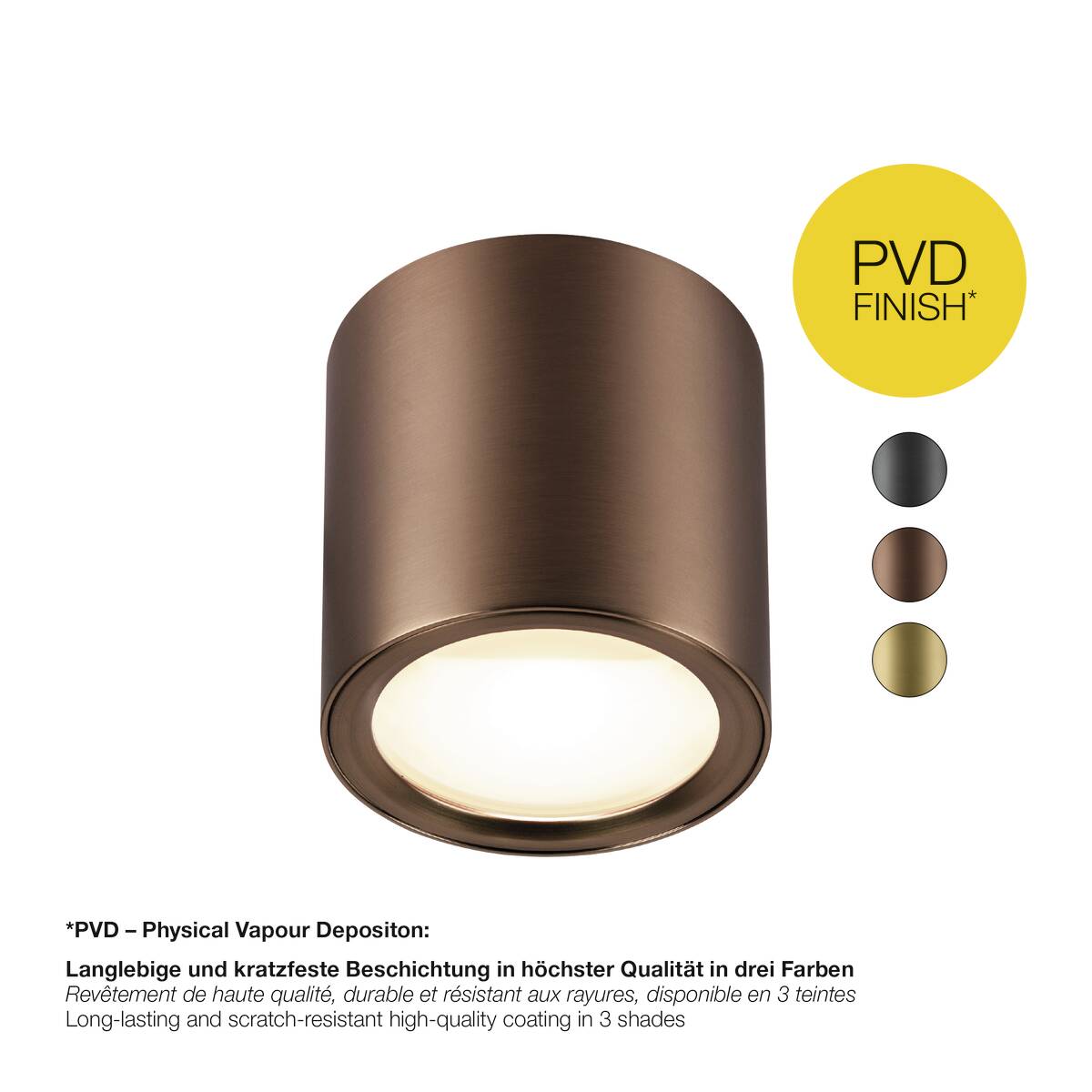 Mit hohem Farbwiedergabeindex von CRI >90 und der Dim-to-Warm Dimmbarkeit zu besonders warmem Licht zaubert jedes Mitglied der OCULUS Familie eine einzigartige Stimmung herbei. Dabei sorgt die spezielle Linsenoptik für einen scharf konturierten Lichteffekt, der die Leuchte zur idealen Akzentbeleuchtungsquelle im gehobenen Privatbereich, in Arztpraxen, Kanzleien, Cafés, Hotels und Restaurants macht. Durch den Einsatz der beiliegenden gefrosteten Scheibe kann das Licht optional von scharf konturierter zu diffuser Lichtverteilung angepasst werden. Neben den klassischen Varianten in Schwarz und Weiß sind ausgewählte OCULUS Leuchten auch in drei weiteren edlen Farben erhältlich: messing, dunkel kupfer und dunkel bronze. Diese werden durch ein hochwertiges PVD-Verfahren (Physical Vapour Deposition) erzeugt – eine echte Metallbeschichtung, die deutlich kratzfester, UV-beständiger und farbstabiler ist als lackierte Oberflächen.