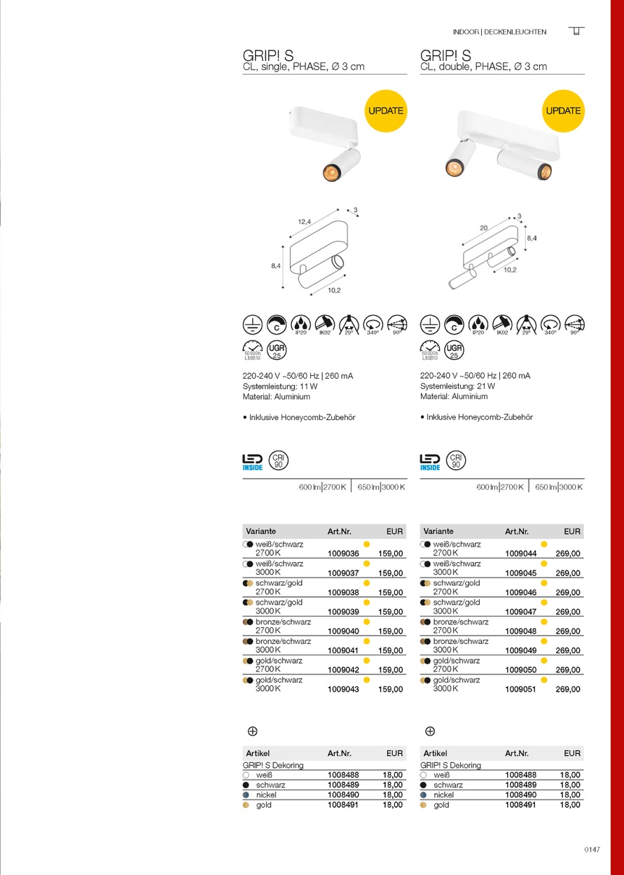 GRIP! – die markante Leuchtenfamilie für anspruchsvolle Lichtgestaltung. Mit ihrem charakteristischen gerändelten Front-Ring und vielen neuen Pendel-, Aufbau- und Einbauvarianten bietet GRIP! jetzt noch mehr Möglichkeiten für individuelle Lichtkonzepte. Der serienmäßig mitgelieferte Wabenraster-Einsatz reduziert Blendung und sorgt für optimalen Sehkomfort. Unterschiedliche Farben und Ausführungen fügen sich harmonisch in Wohnräume, Hotels oder Gastronomie ein. Hochwertige Technik mit CRI>90, 50.000 h Lebensdauer und die einfache Installation machen GRIP! zu einer rundum überzeugenden Wahl.