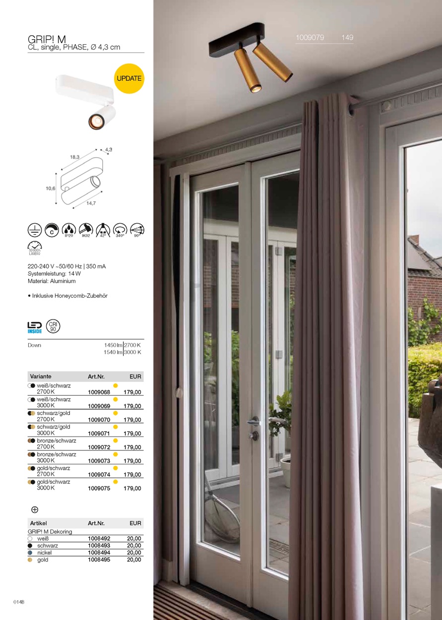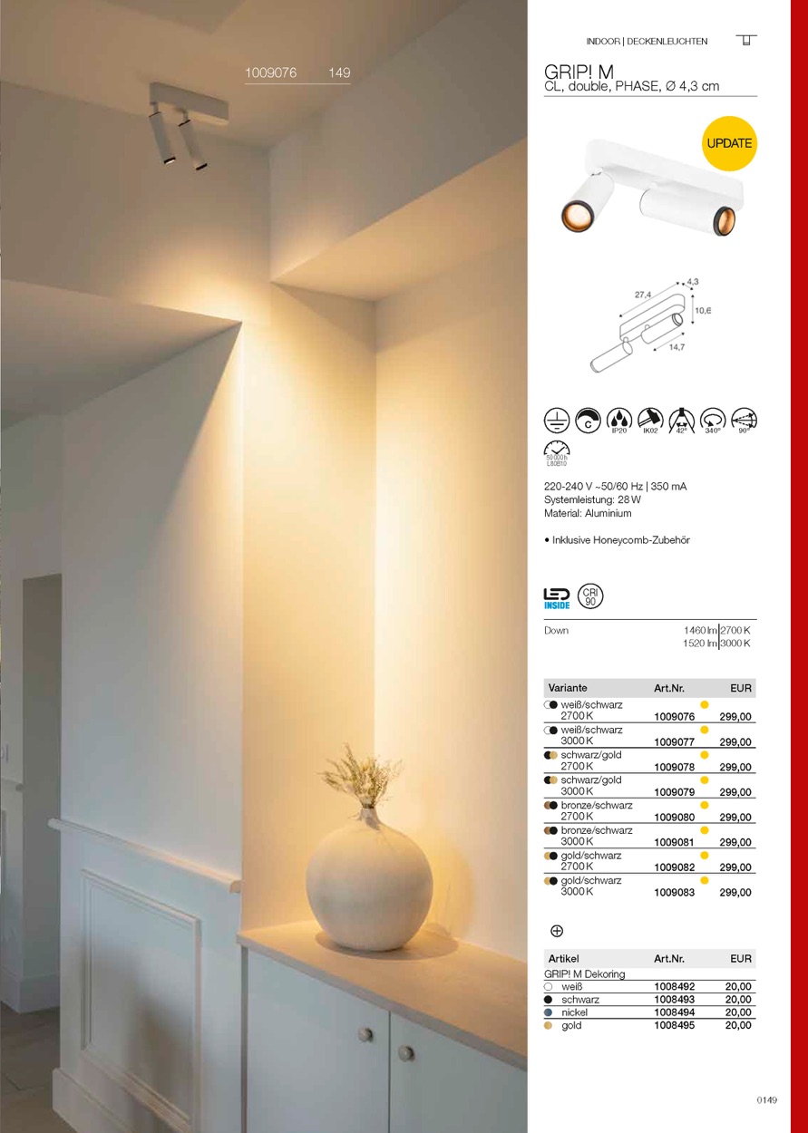GRIP! – die markante Leuchtenfamilie für anspruchsvolle Lichtgestaltung. Mit ihrem charakteristischen gerändelten Front-Ring und vielen neuen Pendel-, Aufbau- und Einbauvarianten bietet GRIP! jetzt noch mehr Möglichkeiten für individuelle Lichtkonzepte. Der serienmäßig mitgelieferte Wabenraster-Einsatz reduziert Blendung und sorgt für optimalen Sehkomfort. Unterschiedliche Farben und Ausführungen fügen sich harmonisch in Wohnräume, Hotels oder Gastronomie ein. Hochwertige Technik mit CRI>90, 50.000 h Lebensdauer und die einfache Installation machen GRIP! zu einer rundum überzeugenden Wahl.