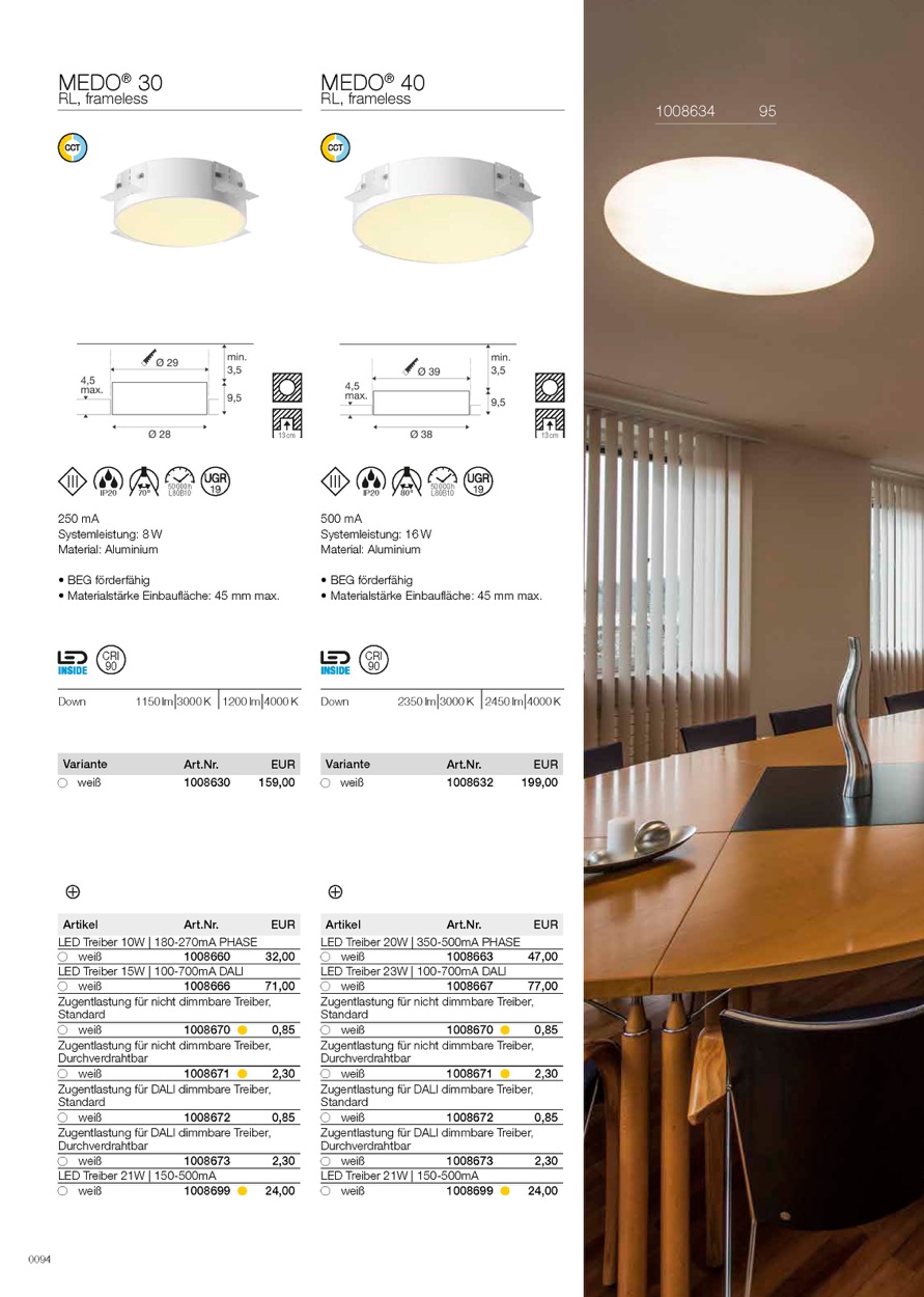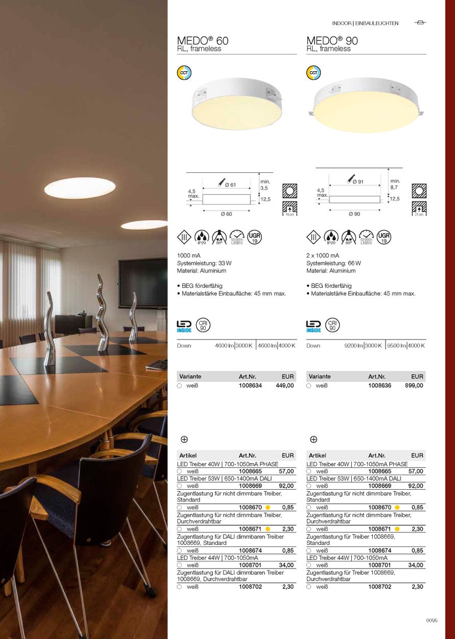 Die beste MEDO® aller Zeiten ist auch als Deckeneinbauleuchte in vier verschiedenen Größen verfügbar, inklusive Rahmen oder auch rahmenlos. Dabei begeistert sie durch eine längere Lebensdauer und förderfähige Energieeffizienz von über 140 lm/W. Der Farbwiedergabeindex CRI >90 gewährleistet eine farbtreue und mit UGR <19 nahezu blendfreie Lichtqualität, wodurch der Einsatz in Büros möglich ist. Für individuelle Einsatzmöglichkeiten sorgt der CCT-Switch, der eine einfache Auswahl zwischen 3000 K und 4000 K erlaubt. Bitte beachten Sie, dass Treiber und Zugentlastung separat erworben werden müssen.