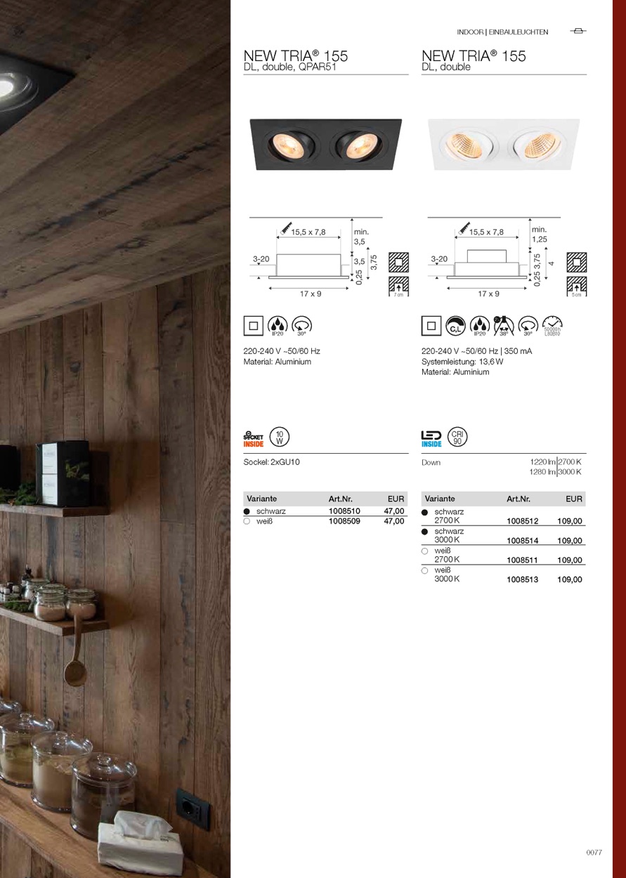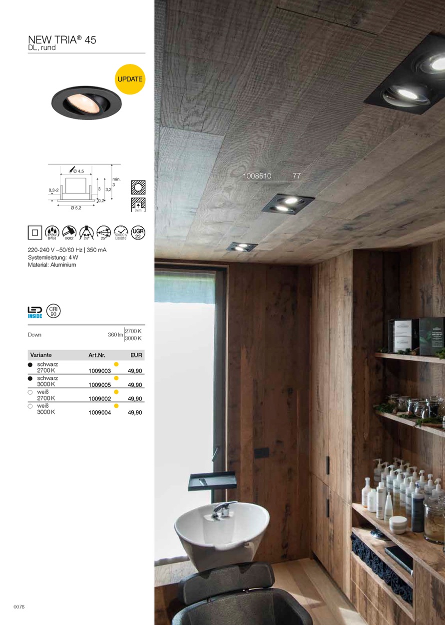 Die NEW TRIA® 45 DL setzt neue Standards für kompakte Deckeneinbauleuchten. Diese modernisierte Version überzeugt mit einer beeindruckenden Effizienz von 90 lm/W und einer hervorragenden Farbwiedergabe von CRI90, wodurch Farben besonders naturgetreu dargestellt werden. Dank einer hohen Lebensdauer von 50.000 Stunden (L80B10) bietet sie eine nachhaltige und langlebige Beleuchtungslösung. Mit einem Einbaudurchmesser von nur 45 mm und einem Lichtstrom von 360 lm ist die NEW TRIA® 45 ideal für Anwendungen, bei denen eine kleine, leistungsstarke Einbauleuchte gefragt ist. Die Leuchte ist in den zeitlosen Farben Schwarz und Weiß sowie in den Lichtfarben 2.700 K und 3.000 K erhältlich, was eine vielseitige Anpassung an unterschiedliche Raumkonzepte ermöglicht.