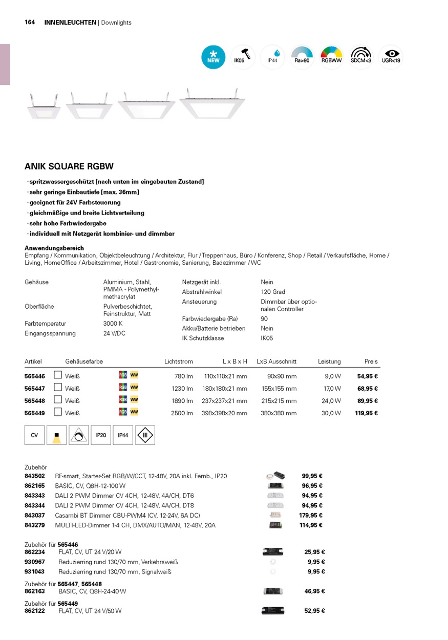 Deko-Light, Downlight, Anik Square 155, 23 W, DIM, RGB/3000 K, Weiß, 1510 lm, Spannungskonstant, Eingangsspannung: 24 V/DC, Dimmbar: Ja, Dimmbar über optionalen Controller, Aluminium, Stahl, PMMA, Pulverbeschichtet, Feinstruktur, Matt, IP 20, IP 44, Länge: 180 mm, Breite: 180 mm, Höhe: 21 mm, Ausschnittssmaß Länge: 155 mm, Ausschnittssmaß Breite: 155 mm, Arbeitstemperatur: -10 bis 45 °C, Lebensdauer L70 / B50: 50000 h