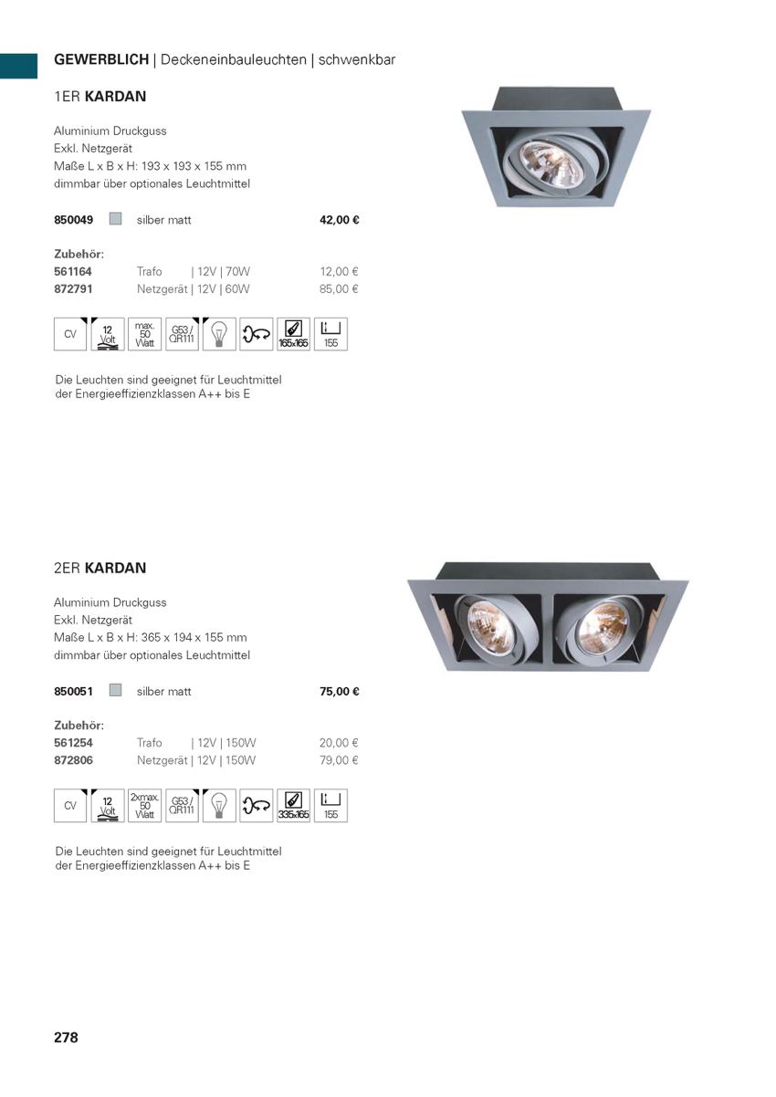 Weiterführende Links zu "Deko-Light Deckeneinbauleuchte, Kardan, 1x max. 70 W G12, Silber, Aluminiumdruckguss, Silber, 70W"