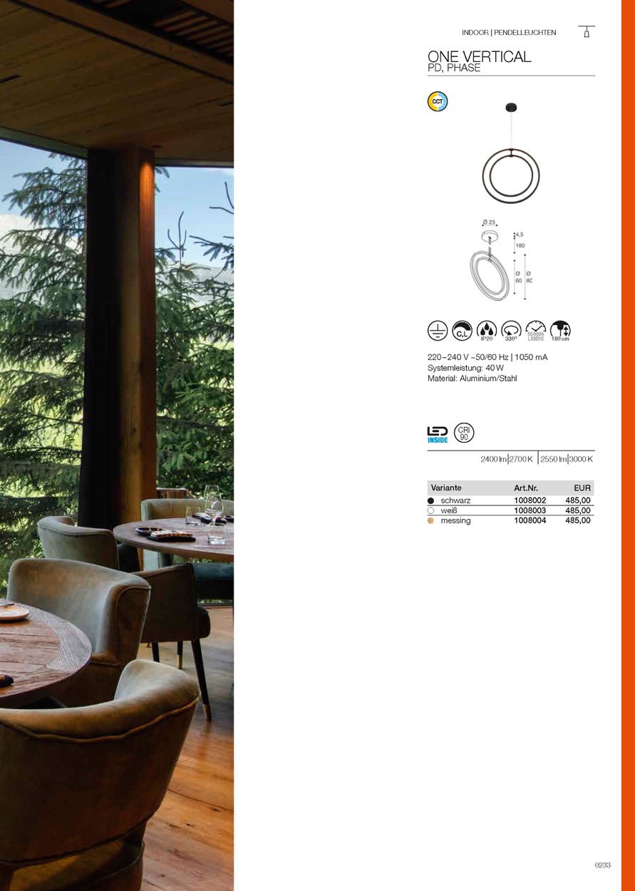Eleganz trifft auf moderne Technologie. ONE VERTICAL PD PHASE präsentiert sich in einem außergewöhnlichen Design: die vertikal angeordneten Ringe unterschiedlicher Größe greifen kunstvoll ineinander und schaffen einen außergewöhnlichen Hingucker im Raum. Mit einem CRI >90 und der wählbaren Lichtfarbe von 2700 K oder 3000 K (CCT-Switch), bietet die LED-Pendelleuchte hochqualitatives Licht. Die Dimmfunktion verleiht jedem Raum die gewünschte Atmosphäre, ideal für private Wohnräume und kleinere Projekte. Als Teil der ONE Familie fügt sich ONE VERTICAL PD PHASE nahtlos in aktuelle Design-Trends ein.