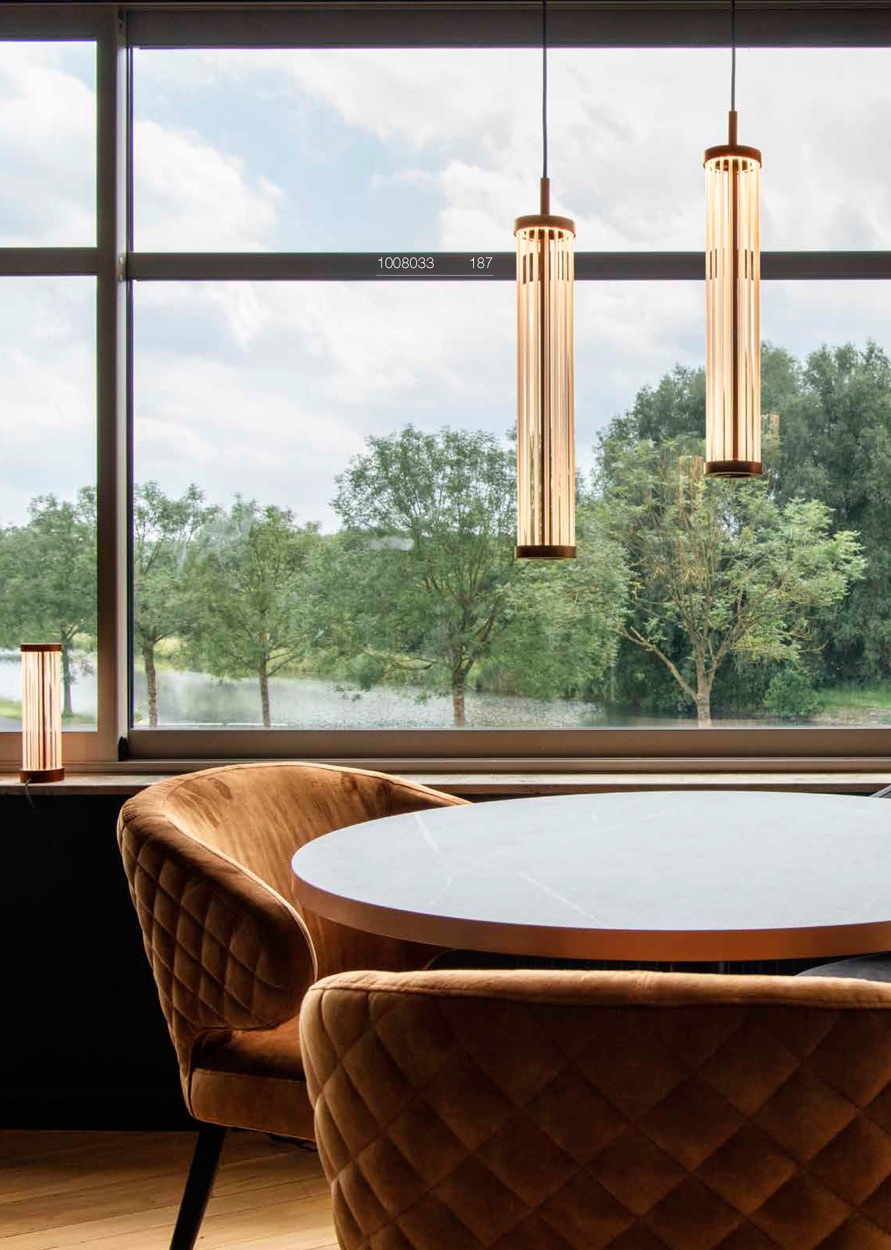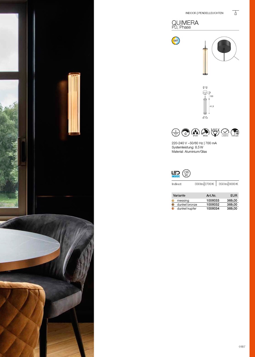 Die Pendel-, Wand- und Tischleuchten der QUIMERA Leuchtenfamilie überzeugen durch zeitlose Eleganz. Jedes Mitglied ist mit einer hochwertigen PVD-Beschichtung versehen, wodurch hervorragende Oberflächeneigenschaften enststehen. Auch die drei Farben Aged bronze, Matt nickel plated und Brushed brass kommen damit besonders gut zur Geltung. Zusätzlich sorgen die eleganten Gravurlinien im Glas dafür, dass das Licht indirekt erscheint, was die edle und zeitlose Ausstrahlung nur noch erhöht.
