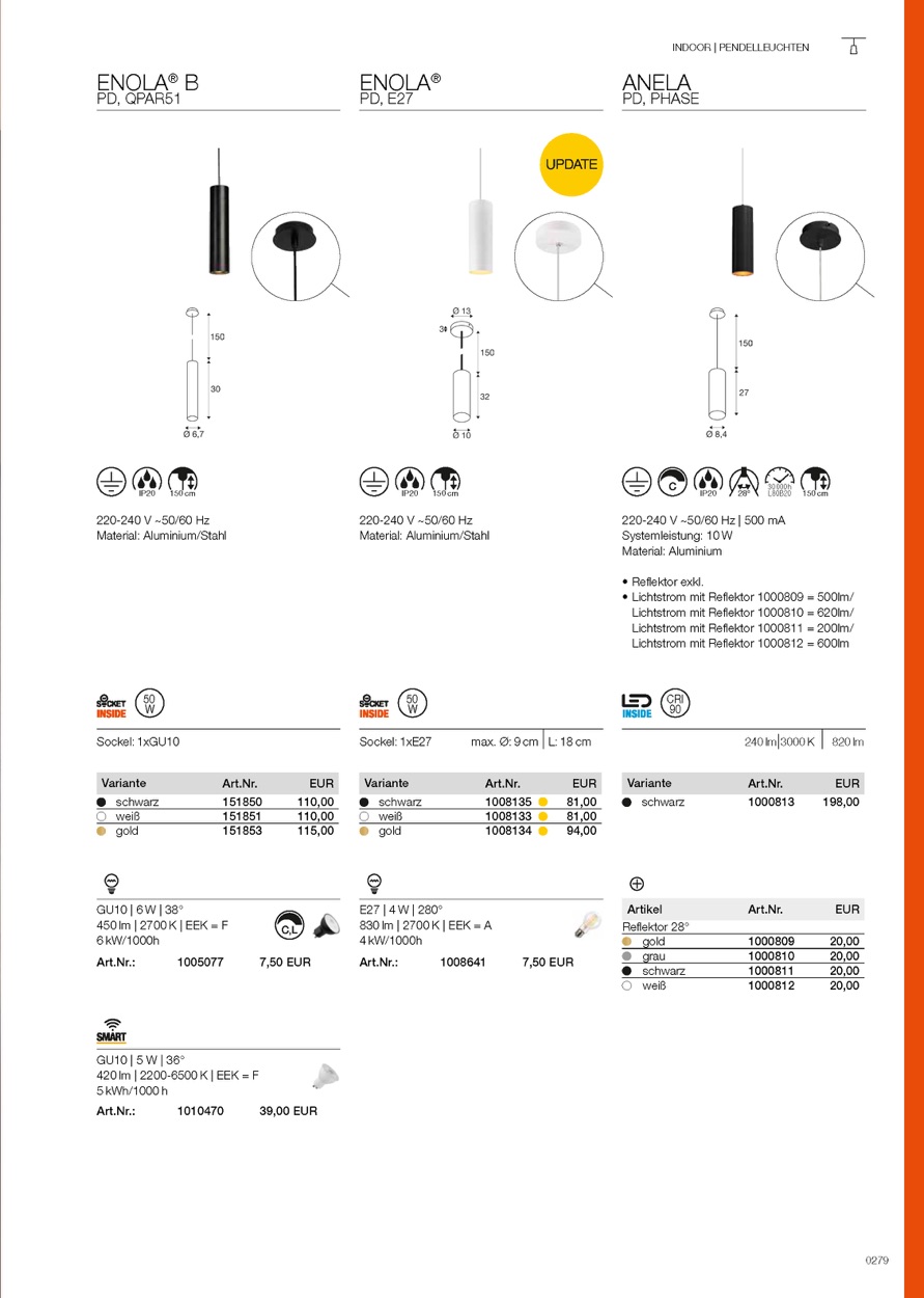 Die ENOLA Pendelleuchte ist aus Aluminium gefertigt und besteht aus einem nach unten gerichteten Zylinder. Durch die neuen edlen Gehäusefarben bietet sich die ENOLA Pendelleuchte zur kombinierten Installation an. Somit können vom Kunden individuelle Farbspiele erschaffen werden. Mit einem E27 Sockel für Allgebrauchs- oder Energiesparlampen ausgestattet, kann die ENOLA Pendelleuchte direkt an 230V Netzspannung betrieben werden.