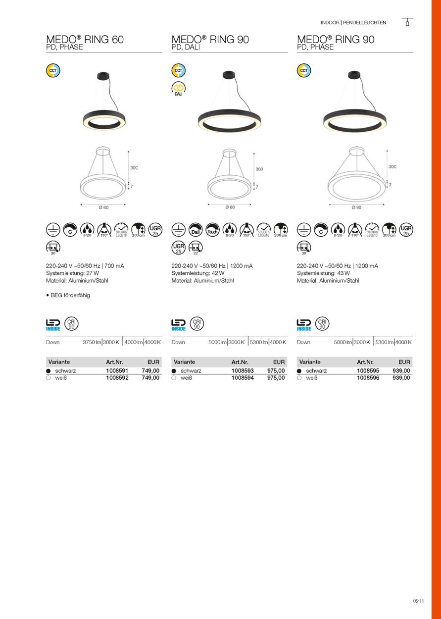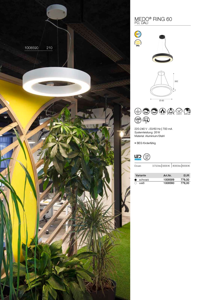 Die beste MEDO® aller Zeiten gibt es jetzt auch als Pendelleuchte im eleganten Design: Die MEDO® RING überzeugt durch eine längere Lebensdauer und bessere Energieeffizienz von über 120 lm/W. Sie ist in zwei Größen und je zwei Farben verfügbar, über Phasenabschnitt oder DALI steuerbar. Durch den CCT-Switch (3000 K/4000 K) kann die Lichttemperatur passend für den Anwendungsfall ausgewählt werden.