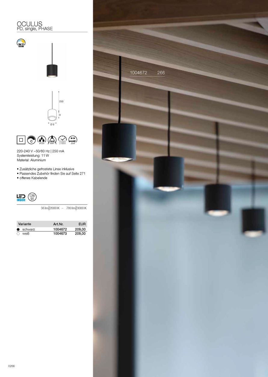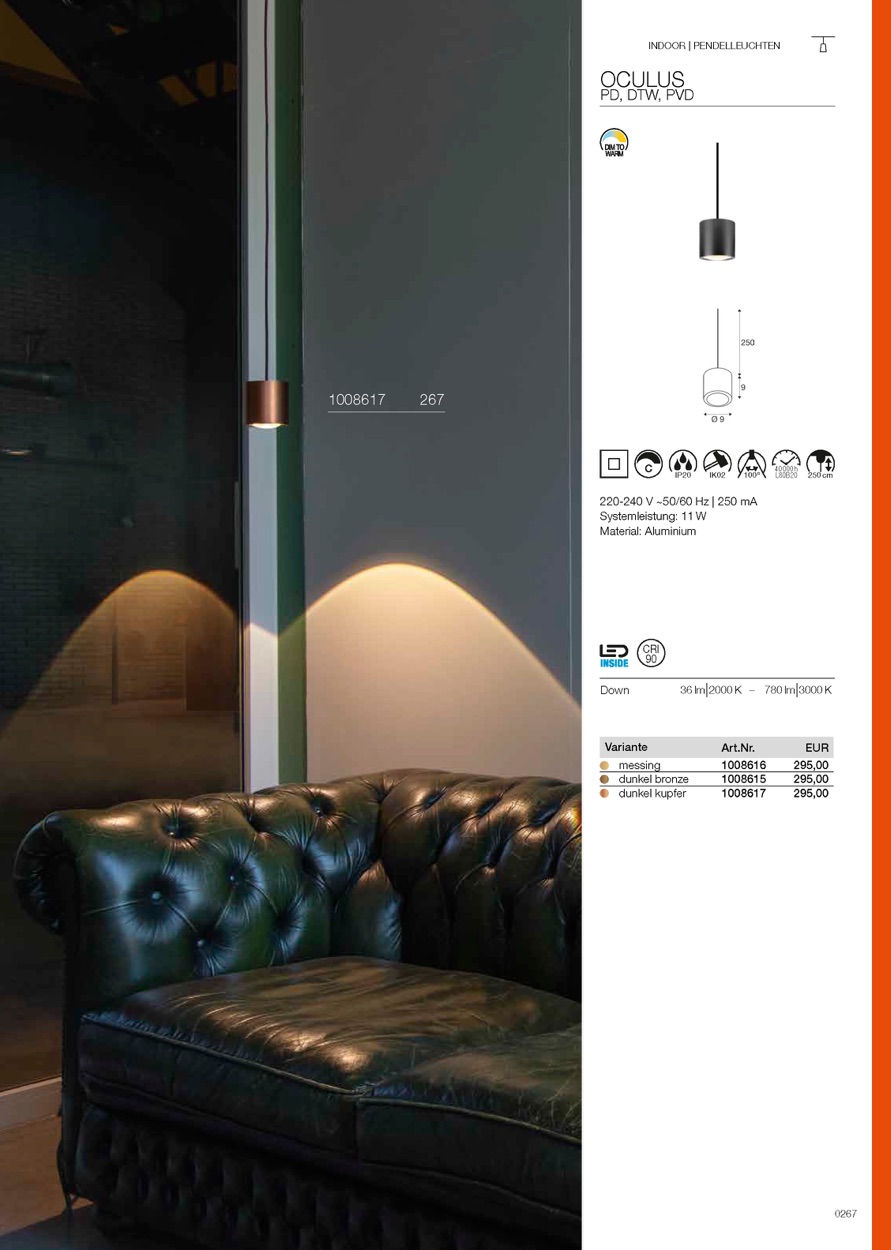 Mit hohem Farbwiedergabeindex von CRI >90 und der Dim-to-Warm Dimmbarkeit zu besonders warmem Licht zaubert jedes Mitglied der OCULUS Familie eine einzigartige Stimmung herbei. Dabei sorgt die spezielle Linsenoptik für einen scharf konturierten Lichteffekt, der die Leuchte zur idealen Akzentbeleuchtungsquelle im gehobenen Privatbereich, in Arztpraxen, Kanzleien, Cafés, Hotels und Restaurants macht. Durch den Einsatz der beiliegenden gefrosteten Scheibe kann das Licht optional von scharf konturierter zu diffuser Lichtverteilung angepasst werden. Neben den klassischen Varianten in Schwarz und Weiß sind ausgewählte OCULUS Leuchten auch in drei weiteren edlen Farben erhältlich: messing, dunkel kupfer und dunkel bronze. Diese werden durch ein hochwertiges PVD-Verfahren (Physical Vapour Deposition) erzeugt – eine echte Metallbeschichtung, die deutlich kratzfester, UV-beständiger und farbstabiler ist als lackierte Oberflächen.