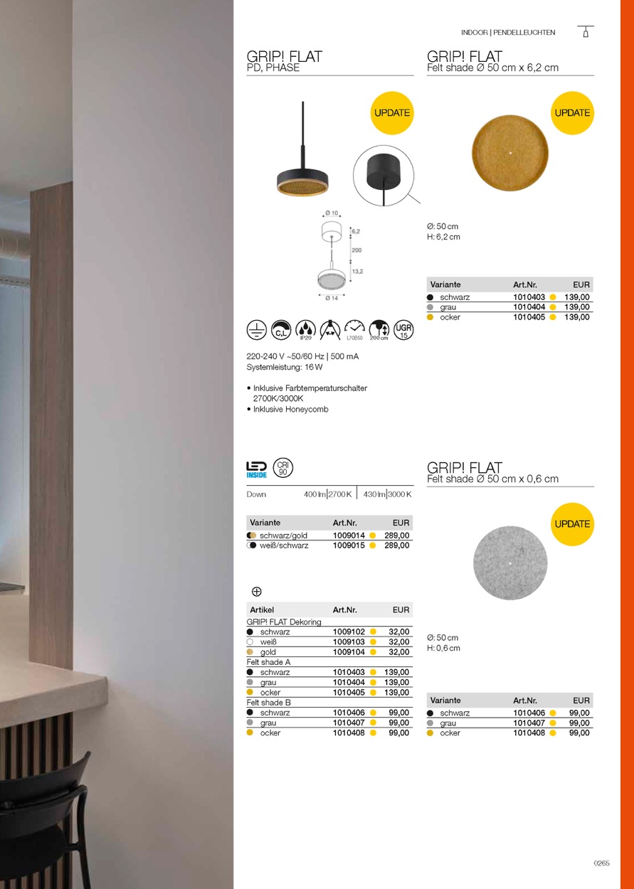 Die stilvolle Ergänzung der GRIP! Familie – GRIP! FLAT – bringt weiches, diffuses Licht ins Spiel. Vielseitige Varianten überzeugen mit dem charakteristischen, fein gerändelten Front-Ring, der ein elegantes Designstatement setzt. Ein serienmäßig mitgelieferter Wabenraster-Einsatz reduziert Blendung und sorgt für optimalen Sehkomfort. Optional setzen trendige Filzschirme dekorative Akzente – ideal für Wohnräume, Hotels und Gastronomie.