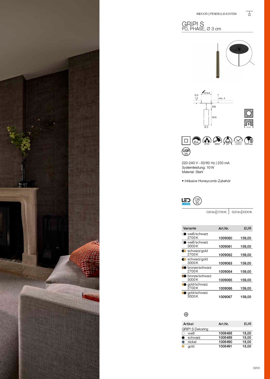 GRIP! – die markante Leuchtenfamilie für anspruchsvolle Lichtgestaltung. Mit ihrem charakteristischen gerändelten Front-Ring und vielen neuen Pendel-, Aufbau- und Einbauvarianten bietet GRIP! jetzt noch mehr Möglichkeiten für individuelle Lichtkonzepte. Der serienmäßig mitgelieferte Wabenraster-Einsatz reduziert Blendung und sorgt für optimalen Sehkomfort. Unterschiedliche Farben und Ausführungen fügen sich harmonisch in Wohnräume, Hotels oder Gastronomie ein. Hochwertige Technik mit CRI>90, 50.000 h Lebensdauer und die einfache Installation machen GRIP! zu einer rundum überzeugenden Wahl.