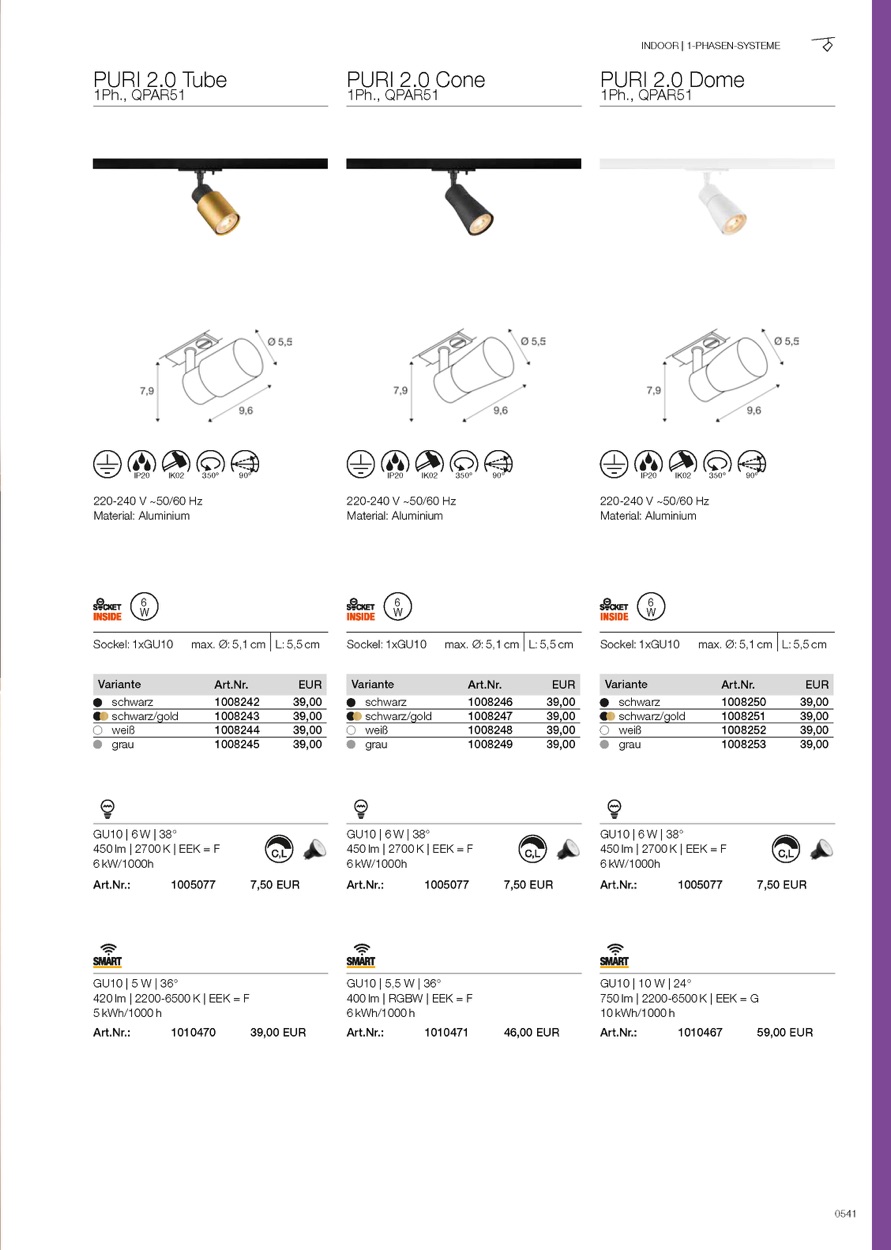 Die neue und rundum modernisierte PURI 2.0 Produktfamilie beinhaltet Spots und Pendelleuchten für das 1- und 3-Phasen-System sowie Wand- und Deckenaufbauleuchten in vielfältigen Ausführungen und Farben. Durch die Kombination mit den Leuchtenschirmen in drei modernen Formen und sechs trendigen Farben gibt es für jedes Interior eine passende PURI 2.0. Und falls Sie eine ganz spezielle Leuchte zusammensetzen möchten, gibt es die PURI 2.0 auch als Mix & Match System. Alle Leuchten werden mit GU10 Leuchtmitteln betrieben.