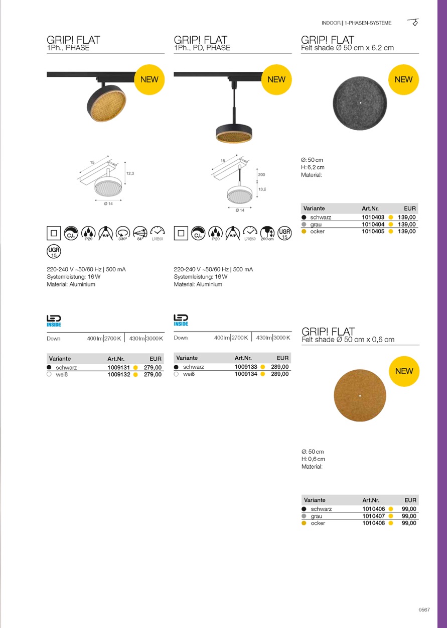 Die stilvolle Ergänzung der GRIP! Familie – GRIP! FLAT – bringt weiches, diffuses Licht ins Spiel. Vielseitige Varianten überzeugen mit dem charakteristischen, fein gerändelten Front-Ring, der ein elegantes Designstatement setzt. Ein serienmäßig mitgelieferter Wabenraster-Einsatz reduziert Blendung und sorgt für optimalen Sehkomfort. Optional setzen trendige Filzschirme dekorative Akzente – ideal für Wohnräume, Hotels und Gastronomie.