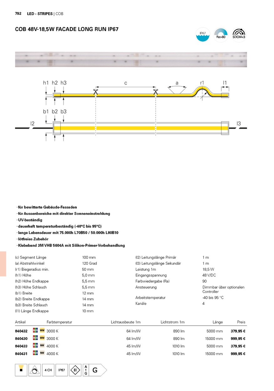 Deko-Light, LED Stripe, Facade Long Run, COB, 48V-18,5W, RGB/4000 K, 15m, Silikon, Lichtstrom 1m: 1010 lm, Leistungsaufnahme 1m: 18.5 W, Dimmbar: Ja, Dimmbar über optionalen Controller, Edelstahl A4, Weiß, IP 67, Segment Länge: 100 mm, Länge: 15000 mm, Breite: 12 mm, Höhe: 0.5 mm, Arbeitstemperatur: -40 bis 95 °C, Lebensdauer L70 / B50: 75000 h, EEI: G