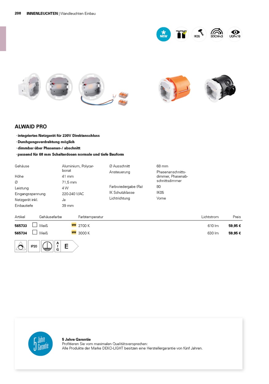 Deko-Light, Wandeinbauleuchte, Alwaid Pro, 4 W, DIM, 2700 K, Weiß, 610 lm, Eingangsspannung: 220-240 V/AC, Dimmbar: Ja, Phasenanschnittsdimmer, Phasenabschnittsdimmer, Aluminium, Polycarbonat, EEI: E, IP 20, Höhe: 41 mm, Durchmesser: 71.5 mm, Ausschnittsmaß Durchmesser: 68 mm, Arbeitstemperatur: -20 bis 40 °C, Lebensdauer L70 / B50: 132000 h