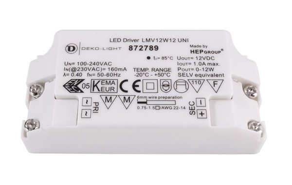 Deko-Light Netzgerät, LMV12W12, Eingangsspannung: 110-240V AC/50-60Hz, Ausgangsspannung: 12V DC, Ausgangsstrom: 0-1000 mA, 12,00 W