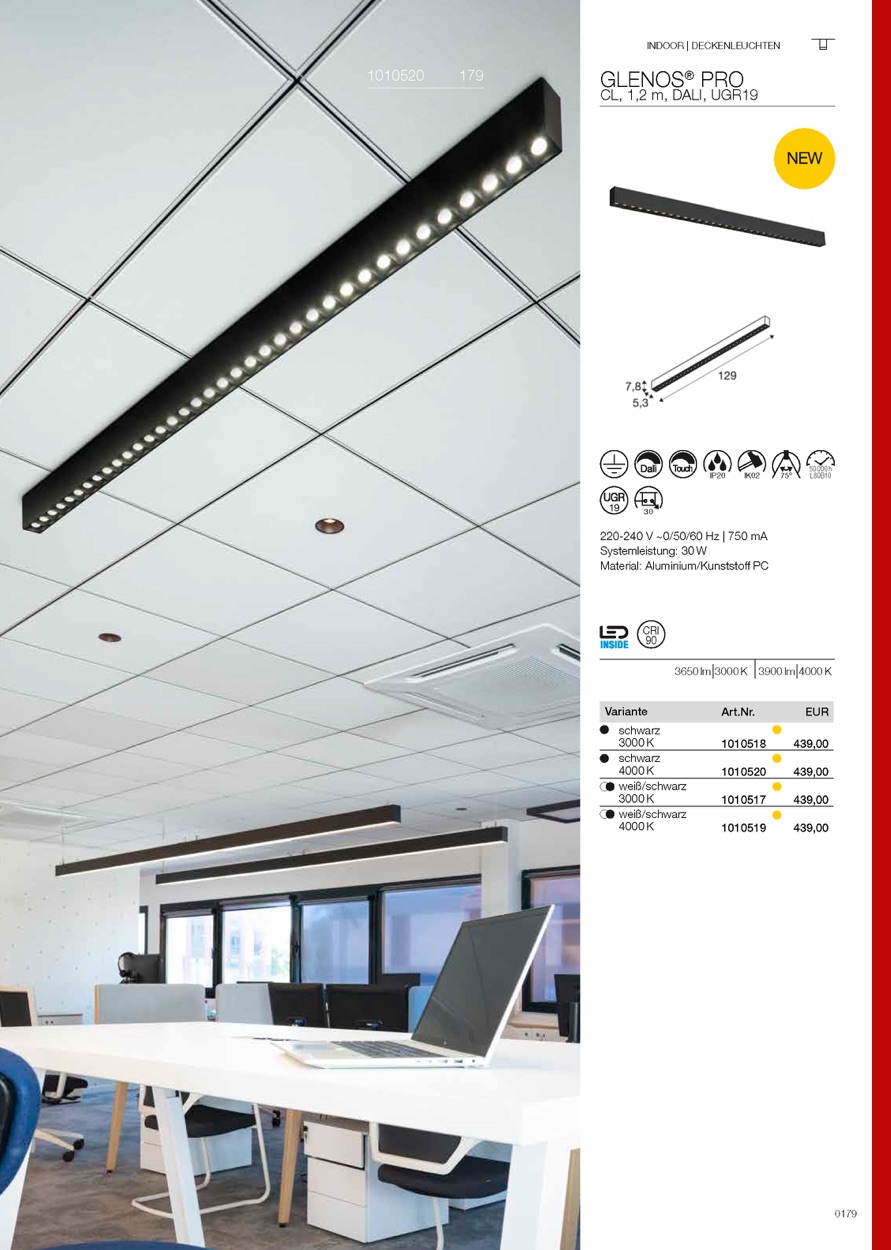 GLENOS® PRO ist die neue lineare Leuchtenfamilie von SLV für anspruchsvolle Büro- und Objektbeleuchtung. Ob Pendel-, Deckenaufbau- oder Einbauvariante: Alle Leuchten sind dank Mikroreflektor besonders blendfrei (UGR<16/19) und bieten mit bis zu 134 lm/W hohe Effizienz bei CRI>90. Die Leuchten lassen sich nahtlos und ohne Lichtaustritt verbinden, sind halogenfrei und garantieren eine gleichmäßige Ausleuchtung mit hohem Sehkomfort.